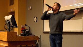 Mannheimer showed a video featuring Chris Emdin, one of the scholars he often references, and then he asked if he would have their undivided attention if he rapped. Then he did, at first with no musical accompaniment before launching into a full-fledged performance backed by the sound system in Brackett 100.