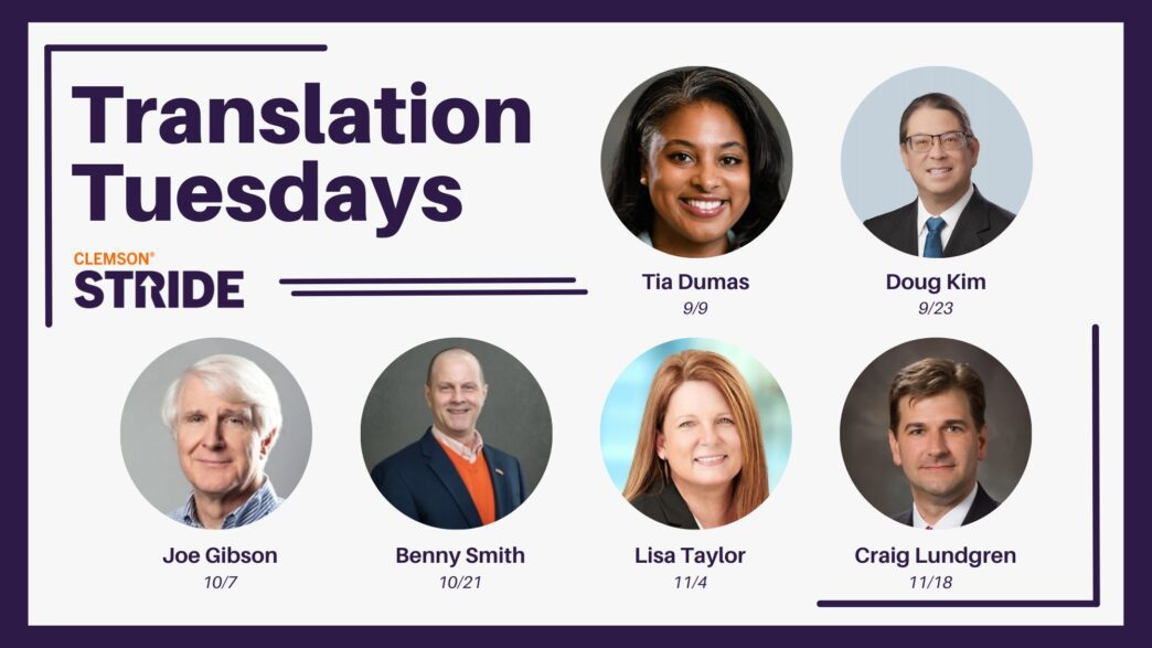 Clemson University’s STRIDE program (Stimulating Translation of Research via Intentional Development and Ecosystem) is excited to announce the launch of Translation Tuesday, a Fall semester webinar series designed to help researchers, faculty and innovators translate their work into real-world results.