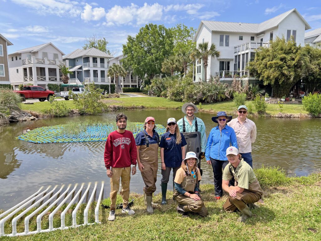 Clemson and the University of South Carolina installed floating wetlands at three ponds in Mt. Pleasant as part of the research project to better understand how to successfully install and maintain floating wetlands in these brackish coastal ponds.