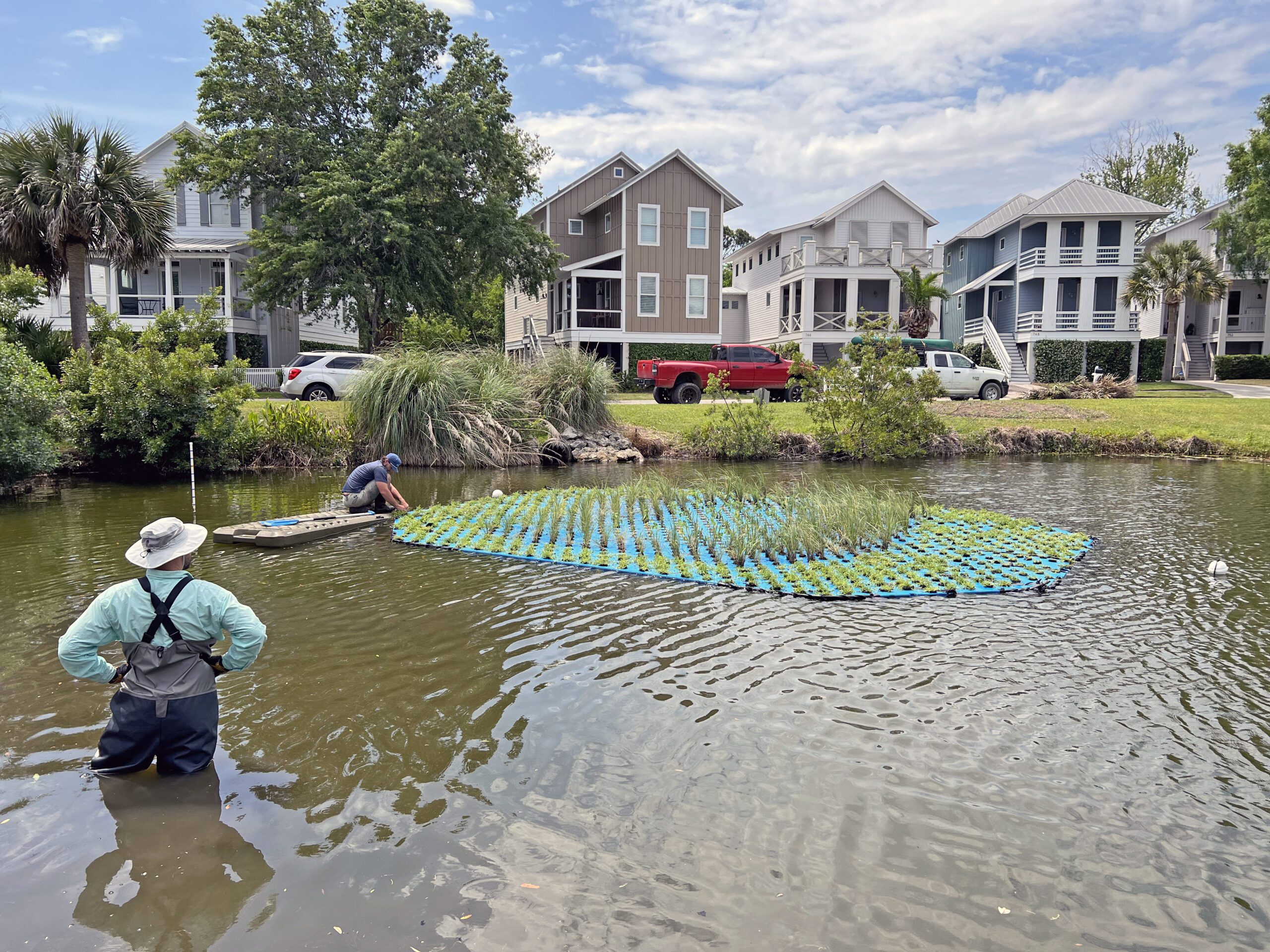 A floating wetland was installed and another harvested during a workshop for residents and municipal partners last year in Mount Pleasant, South Carolina, to demonstrate the process of removing one and replanting the plants along the shoreline to create an additional buffer against shoreline erosion.