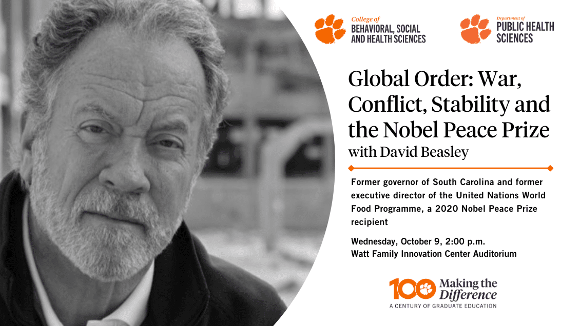 “We are honored to have former governor Beasley join us on October 9 to share his career-long experience and knowledge with the Clemson community,” said Leslie Hossfeld, dean of the College of Behavioral, Social and Health Sciences. “Governor Beasley embodies our mission to build people and communities and his global efforts to reduce hunger and improve economic stability have made a positive difference in the lives of countless individuals across South Carolina, the nation and world.”