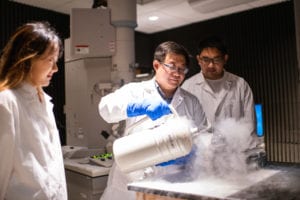 Two Ph.D. students watched Kai He slip on blue, protective gloves and pour liquid nitrogen into a barrel-shaped vessel, causing chilled vapor to billow over the top and spread across the table like a fog.