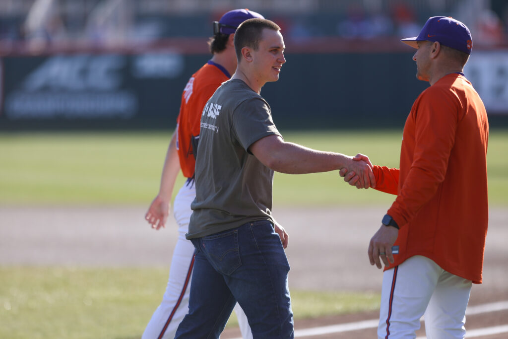 “It was awesome to show my respect for and be part of an appreciation ceremony like that,” he said. “Coach Bakich came up and thanked me for my service. It means something to you in general, but in that moment, it meant a lot more because I was honored on the same weekend as our true heroes memorialized in the Scroll of Honor and other veterans and military leaders here at Clemson.”