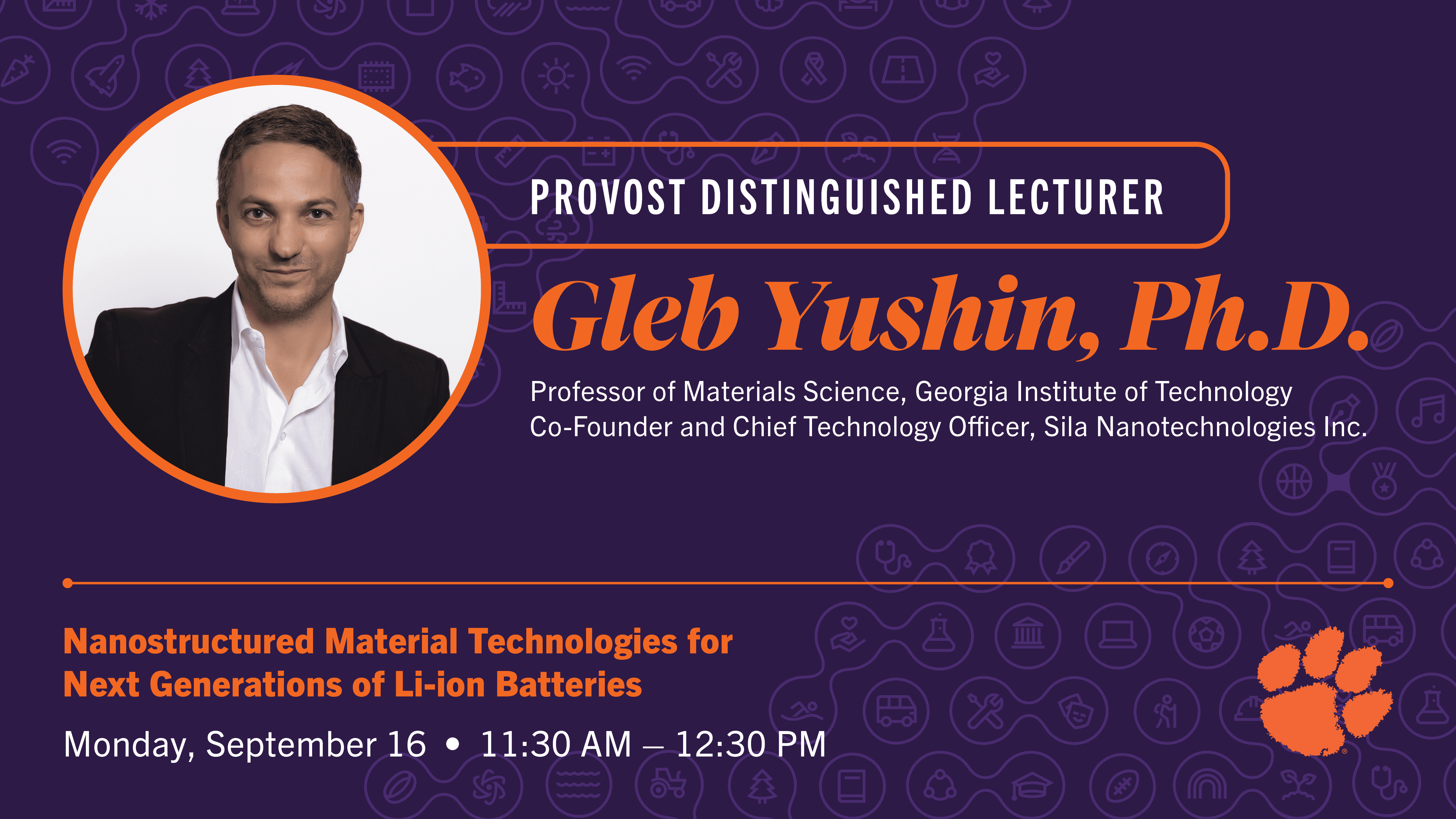 Clemson University’s Office of the Provost and the College of Engineering, Computing and Applied Sciences are proud to host Gleb Yushin as a Provost Distinguished Lecturer on Monday, September 16.