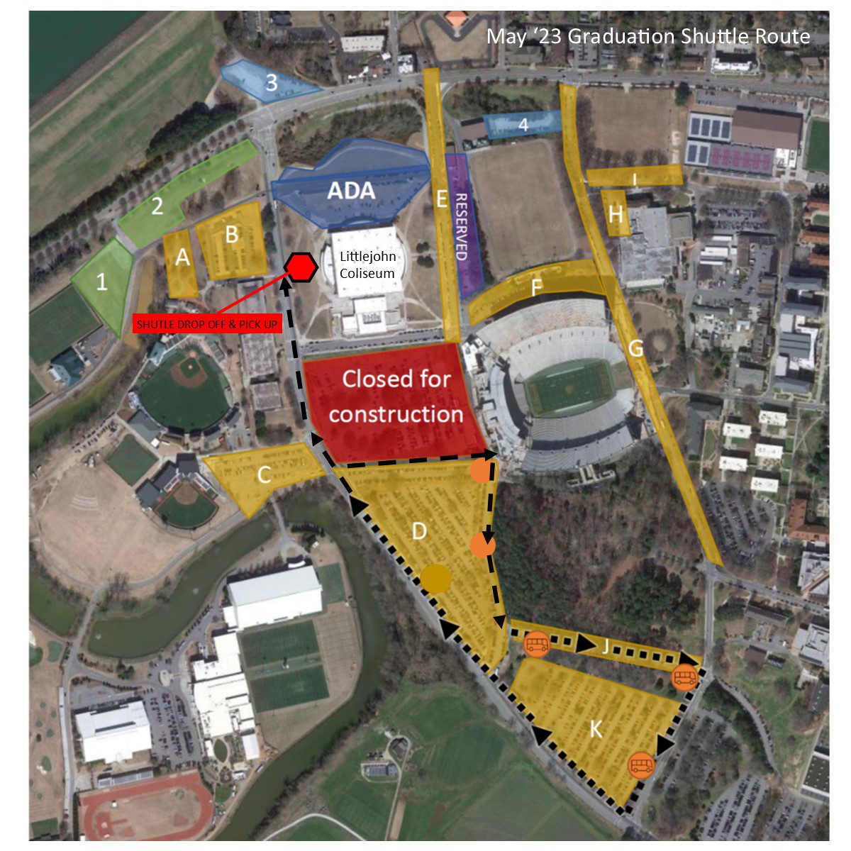 In light of ongoing construction in the West End Zone lot (C-3) next to Memorial Stadium, parking for graduates and guests will be impacted around Littlejohn Coliseum. Shuttle transportation will be available to and from C-2 (labeled D on the adjacent map) and R-3 (labeled K).