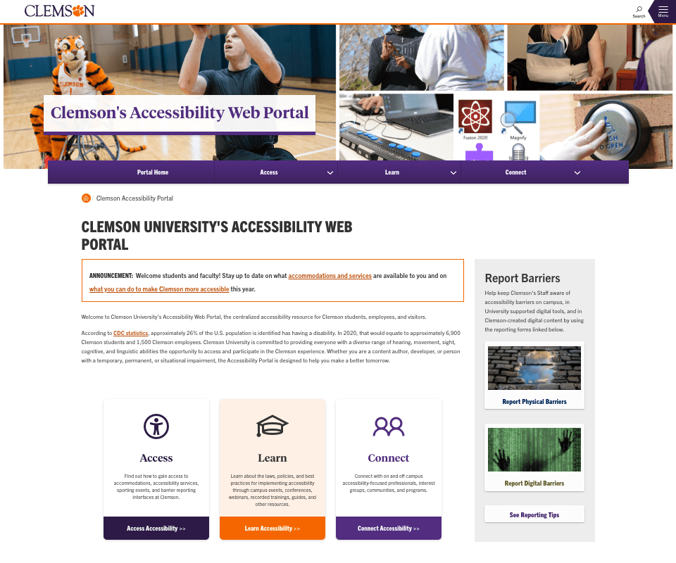 - In the last section, Connect, people can find contact information for the Clemson offices that support accessibility, information about the accessibility-related campus communities, information about external communities, and a link back to the earlier mentioned events section where accessibility-related conferences are also listed. According to Tuten, engaging with the groups in this part of the Portal is a great way to build confidence in the field of accessibility.