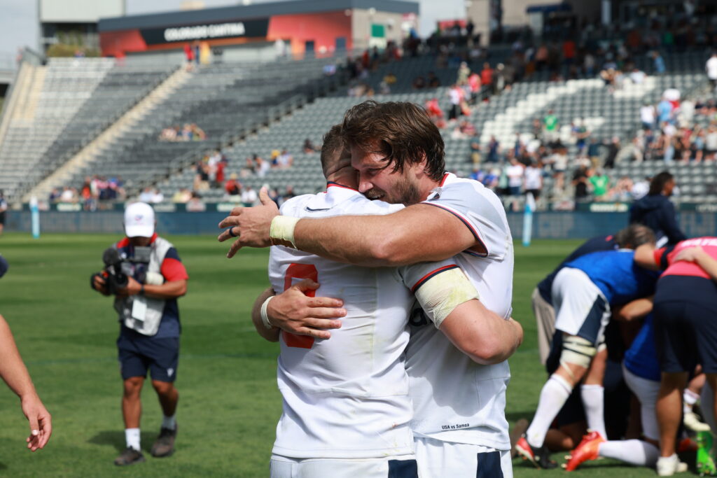 Damm embraces a teammate after securing the win over Samoa that qualified Team USA for the 2027 Rugby World Cup scheduled to be held in Australia.