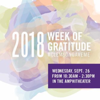CLEMSON – A special event for students – in conjunction with the 2018 Week of Gratitude – will be held 10:30 a.m.-2:30 p.m. Wednesday (Sept. 26) in the Hendrix Student Center amphitheater.