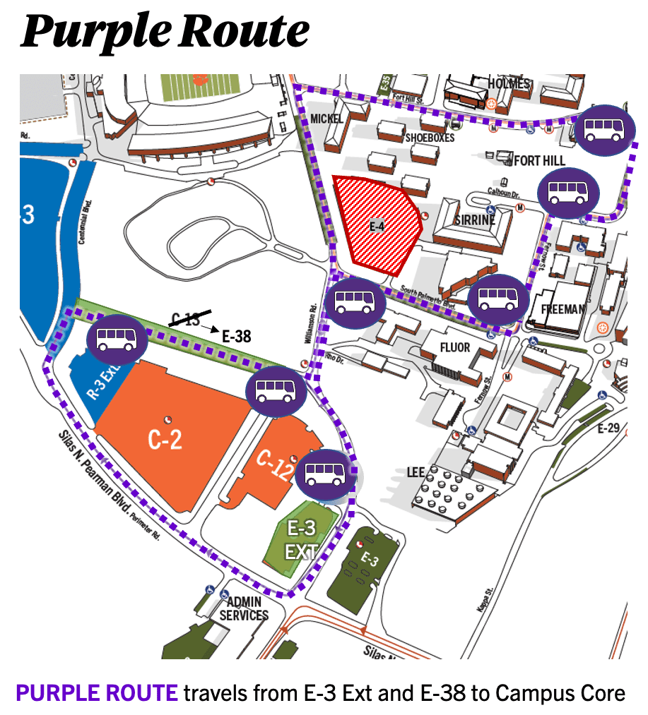 The Purple Route will provide bus transportation for any Clemson employee and student. Lot E-38 (Nu Street) will feature bus stops at either side of the lot. The Purple Route will travel from the Lot E-3 Extension through Core Campus and stop at seven locations. Stops include near Woodland Cemetery, Brackett Hall, Lee and Lowry Hall, and others.