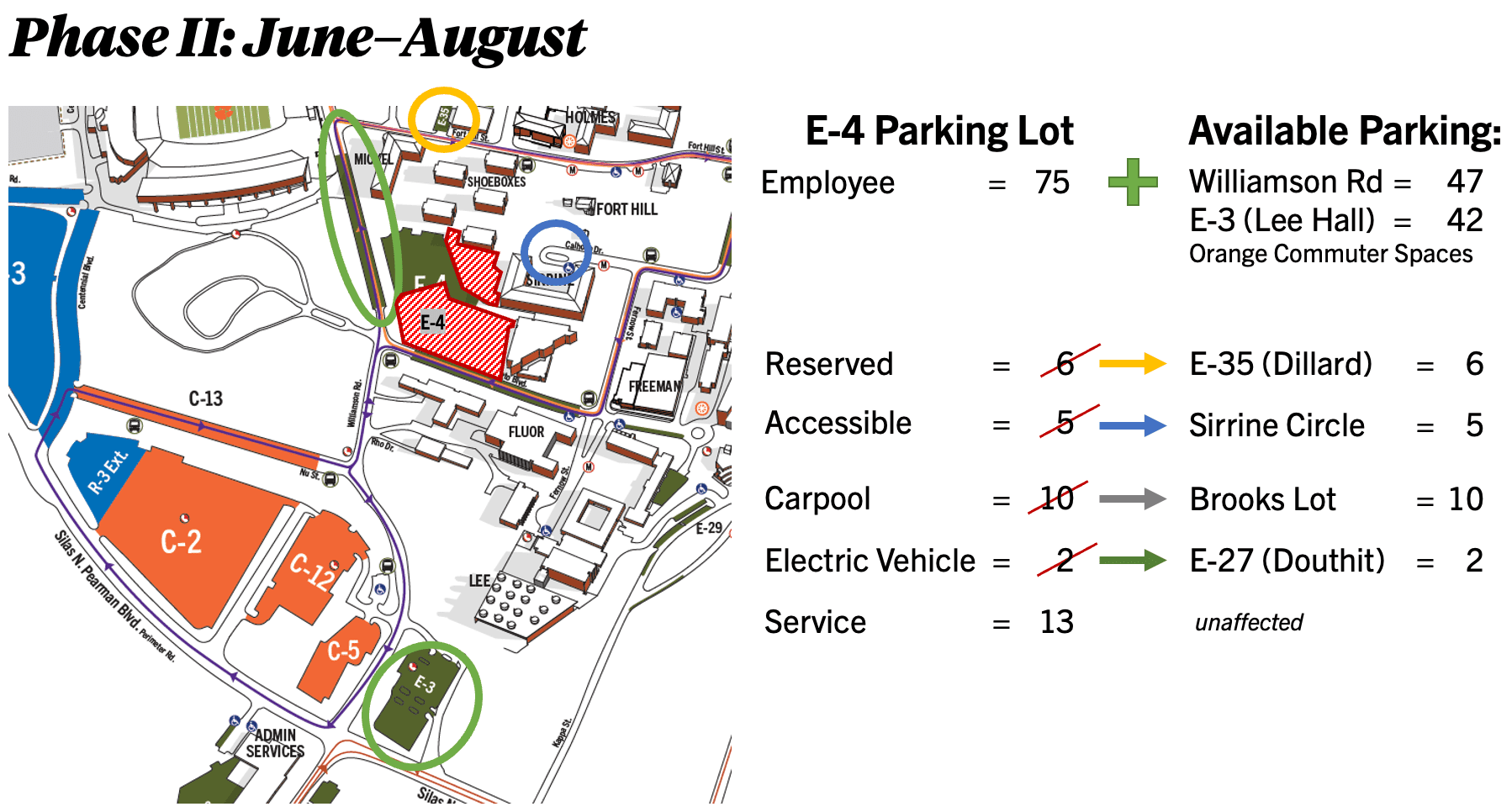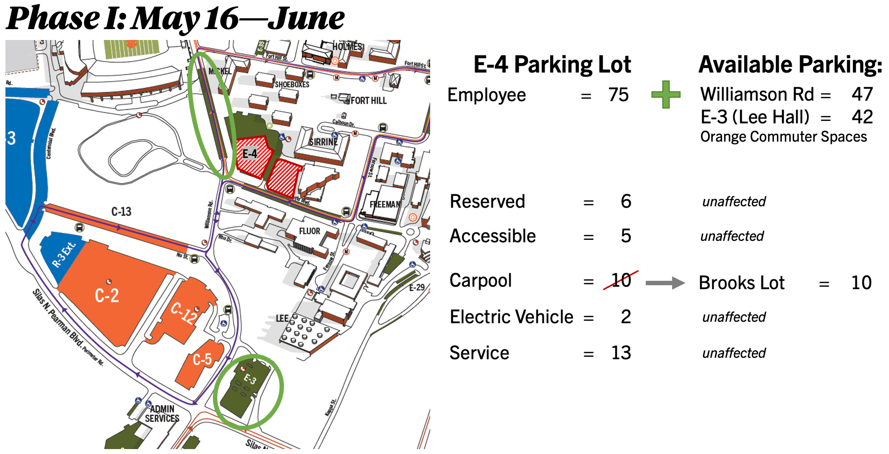 Phase I will feature 75 available spaces in lot E-4 (adjacent to Sirrine Hall). As parking is lighter during the summer, parking will also be available on Williamson Road and Lot E-3 (adjacent to Lee Hall). Employees are also able to park in orange commuter spaces. Lot E-4 will also keep its reserved, accessible, electric vehicle and service spaces available through Phase I, while 10 carpool spaces will be available in the Brooks Center lot.